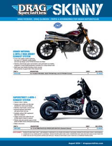 DISCLAIMER: PRODUCTS WITH EMIS CODE 1 ARE EMISSION COMPLIANT IN ALL STATES,INCLUDING CALIFORNIA.PRODUCTS WITH EMIS CODES 2 ARE EMISSION COMPLIANT IN ALL STATES EXCEPT CALIFORNIA. PRODUCTS WITH EMIS CODE 3 ARE“COMPETITION USE”ONLY,AND NOT LEGAL IN ANY STATE FOR STREET USE ON ANY POLLUTION-CONTROLLED VEHICLES. PRODUCTS WITH EMIS CODE 4 HAVE NO U.S.TERRITORY RESTRICTIONS DRAG FATBOOK • DRAG OLDBOOK • PARTS & ACCESSORIES FOR INDIAN MOTORCYCLES dragspecialties.com August 2024 GRAND NATIONAL 2-INTO-2 HIGH-MOUNT EXHAUST SYSTEM • A true race-replica system featuring the same 3.5” diameter muffler bodies and end cap design as the FTR750 flat track race bikes • Stainless steel header pipes and stainless steel perforated core baffles, wrapped in a long-lasting proprietary insulation for a deep exhaust note • Multi-layer heat shields including a 6mm ceramic thermal barrier to guard riders from exhaust heat PART # DESCRIPTION EMIS* SUG. RETAIL 1800-2692 For 18-24 FXBB/FXLR/FLSL/FXFB/FLDE/FLSB/FLHC (Standard Chassis) 3 $1,099.95 SUPERSTREET 2-INTO-1 EXHAUST SYSTEM • Classic 2-into-1 styling • Headers and muffler are fully heat shielded for a blue-proof design • Stainless steel header construction • Brushed stainless steel finish with gloss black end cap • Available without S&S engineered high-flow catalysts • Oxygen sensor ports allow the use of wide band or stock O2 sensors • Models with mid controls require brake pedal kit PART #1610-0709 (sold separately) • Made in the U.S.A. PART # DESCRIPTION EMIS* SUG. RETAIL 1810-3186 For 19-20/22 FTR1200/S, 20/22 FTR1200 Rally and 22 FTR1200 R Carbon 3 $1,199.95