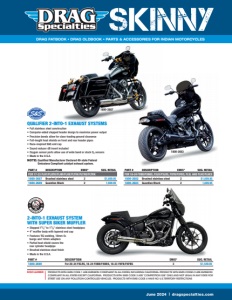 PART # DESCRIPTION SUG. RETAIL 1131-3945 For 17-23 FLHT/FLHR/FLTR/FLHX models and 18-23 Softail models $300.48 EXTRA PLATE CLUTCH KIT • Adds 11% more surface area to clutch pack • Aramid fiber plates have a higher-density compound • The aramid fiber friction plates provide increased durability • Includes one extra friction and steel plate to add 10% to clutch capacity • Heavy-duty springs are included • Made in the U.S.A. PART # DESCRIPTION SUG. RETAIL 1120-0452 Replacement shoe adjuster $46.95 REPLACEMENT SHOE FOR ARMORED ATTITUDE ADJUSTER • Machined from Nylon 66 • Replacement shoe for Armored Attitude primary chain adjuster PART #1120-0437, sold separately • Made in the U.S.A. PART # DESCRIPTION SUG. RETAIL 2120-1332 For 14-23 FLHX, 15-23 FLTRX $99.95 2120-1333 For 99-13 FLHT/FLHR models, 99-09 FLTR models, 06-09 FLHX models (except CVO models) 99.95 2120-1334 For 10-13 FLHX/FLTRX models 99.95 2120-1335 For 09-13 FLTRXSE, FLHXSE 99.95 TOUR-PAK® QUICK-DISCONNECT WIRING HARNESSES • Add power to your Tour-Pak® with quick-disconnect convenience • Plugs into rear fender harness and connects into your Tour-Pak® • Connector is exposed behind seat for easy removal • Made in the U.S.A. PART # DESCRIPTION SUG. RETAIL 2120-1331 For 24 FLHX/FLTRX/FLTRXSTSE, 23 FLHXSE/ FLTRXSE, 21-24 RA1250/1250S (+15”) $89.95 THROTTLE-BY-WIRE EXTENSION HARNESS KIT • Designed and tested to extend your wiring without causing any harm or interference to the motorcycle’s computer when installing taller handlebars • Color coded to connect to the existing Molex connector; simple plug-in installation • Made in the U.S.A. 2120-1332 8 DISCLAIMER: PRODUCTS WITH EMIS CODE 1 ARE EMISSION COMPLIANT IN ALL STATES, INCLUDING CALIFORNIA. PRODUCTS WITH EMIS CODES 2 ARE EMISSION COMPLIANT IN ALL STATES EXCEPT CALIFORNIA. PRODUCTS WITH EMIS CODE 3 ARE “COMPETITION USE” ONLY,AND NOT LEGAL IN ANY STATE FOR STREET USE ON ANY POLLUTION-CONTROLLED VEHICLES. PRODUCTS WITH EMIS CODE 4 HAVE NO U.S.TERRITORY RESTRICTIONS dragspecialties.com JUNE 2024 DRAG FATBOOK • DRAG OLDBOOK • PARTS & ACCESSORIES FOR INDIAN MOTORCYCLES